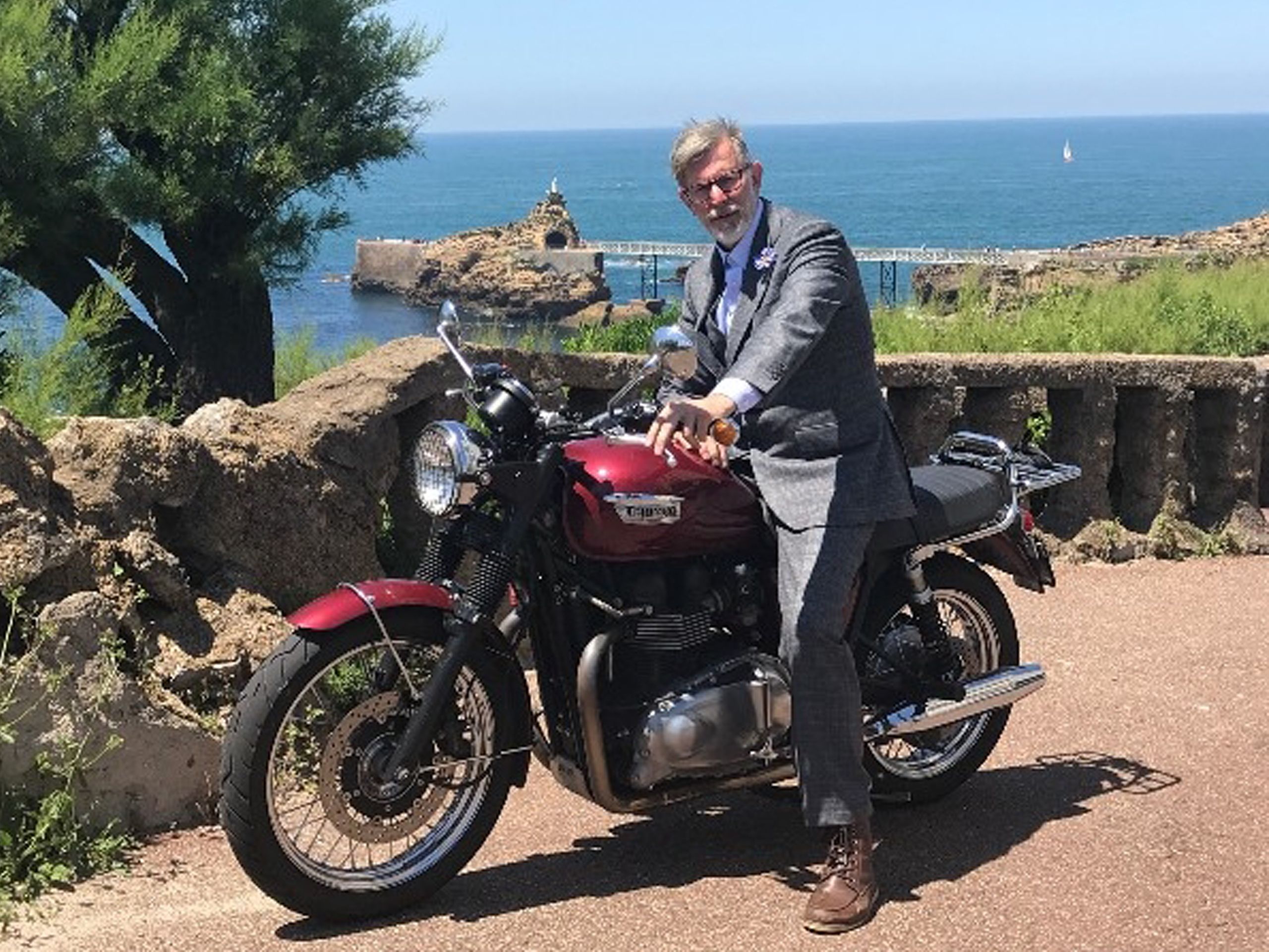 Meines Erachtens ein Beweis, dass ein Anzug eben nicht nur eine „Business-Verkleidung“ ist, sondern eine hervorragende Garderobe für alle Gelegenheiten. Natürlich kann Matthias mit so einem Outfit auch jeden geschäftlichen Termin absolvieren. Doch wenn er sich so wohl darin fühlt, dass er sich damit aufs Motorad hockt, haben wir ne Menge richtig gemacht.